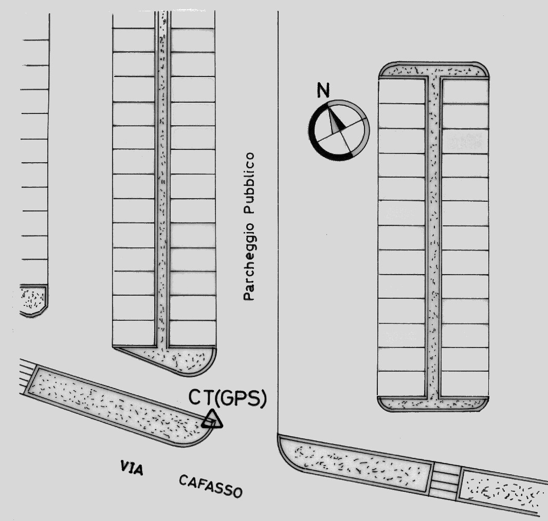 Centrino del tipo "GPS D" fissato in corrispondenza dello spigolo del muretto che delimita la fioriera di sinistra esistente all'ingresso del parcheggio pubblico.