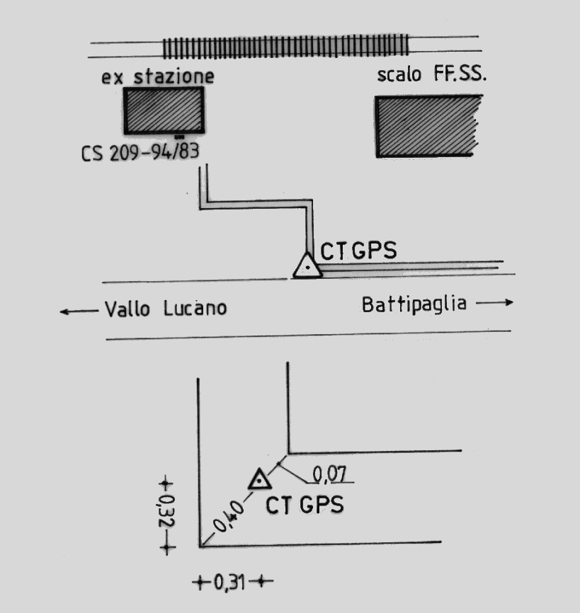 | materializzazione | Centrino di tipo "GPS C" fissato sull'angolo del muretto che delimita lo scalo ferroviario, nei pressi della ex Stazione ferroviaria. |
