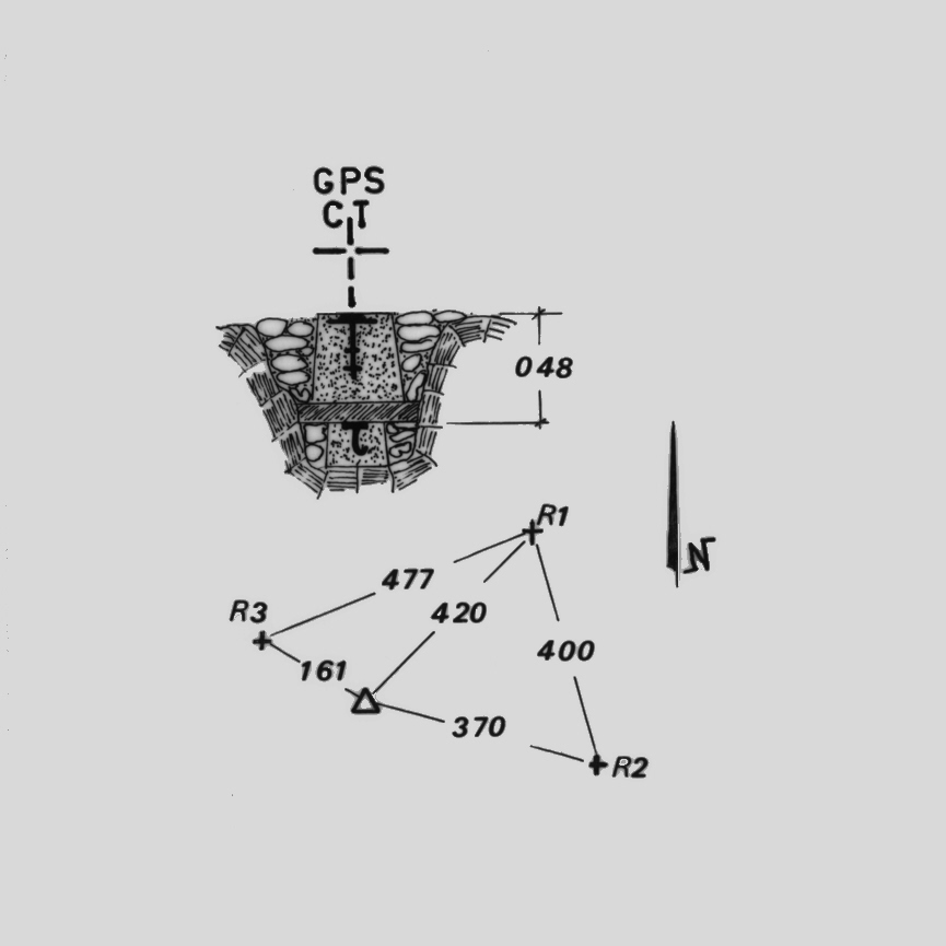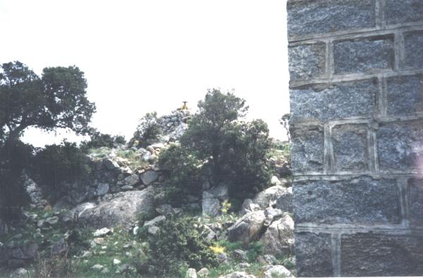 Centrino di tipo "GPS A" fissato su preesistente centrino IGM del tipo di superficie e sottostante coassiale centrino di fondo cementati, in blocchi indipendenti, alla sommità di un antico nuraghe. Riferimenti: tre croci incise su rocce.