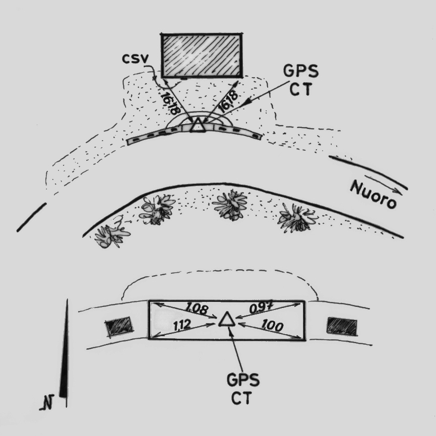 | materializzazione | Centrino del tipo "GPS C" fissato sul primo gradino della scaletta in calcestruzzo al lato della S.S. davanti alla Cantoniera Donnacori. |