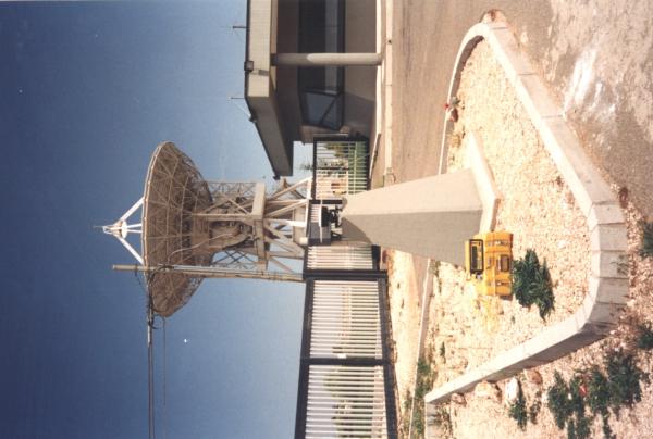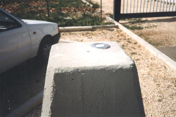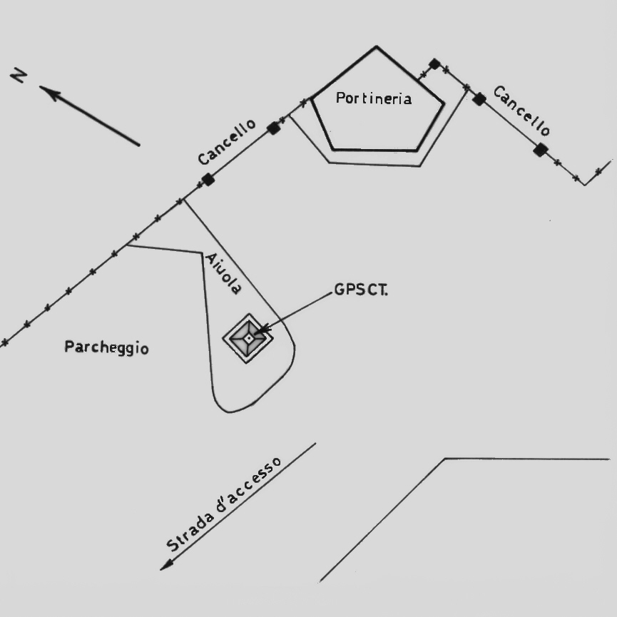 Centrino metallico con foro al centro fissato alla sommità di un pilastro troncopiramidale in calcestruzzo, sito davanti alla portineria dell'ingresso del "Centro di Geodesia Spaziale" e coincidente con l'asse geometrico del pilastro stesso.