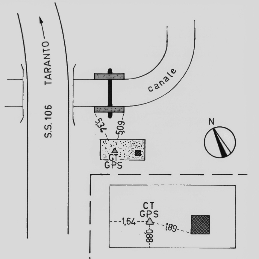 | materializzazione | Centrino di tipo "GPS C" sulla copertura in cemento del deposito dell'impianto di irrigazione, sito sul lato sud – est della SS. 106. |