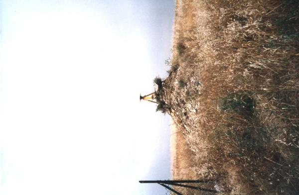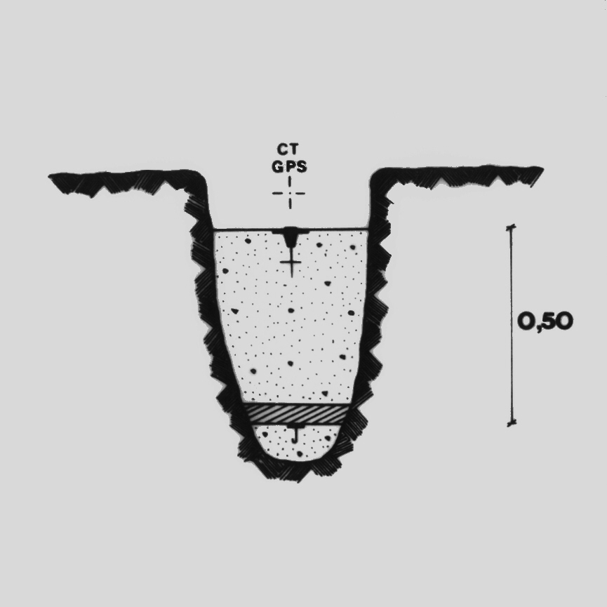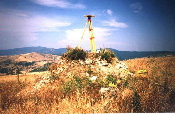 Centrino di tipo "GPS A" fissato su preesistente centrino IGM del tipo di superficie con sottostante centrino di fondo coassiale, posto sul punto più alto del grande pianoro che domina la valle del torrente Camastra.