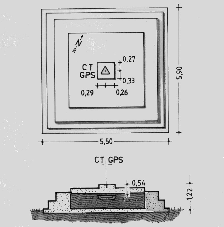 | materializzazione | Centrino di tipo "GPS A" incastonato nel centrino IGM del tipo di superficie cementato nel centro della sommità di una grossa piattaforma in calcestruzzo armato a gradoni a pianta quadrata con sottostante lapide marmorea (con croce di Malta e data d'istituzione 1869 incise) coassiale. |