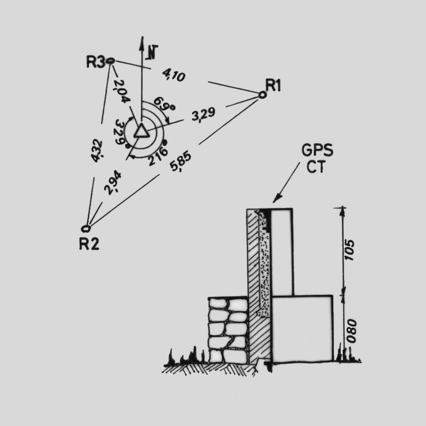| materializzazione | Centrino del tipo "GPS A" fissato su centrino anonimo in ghisa coassiale sia al pilastro in mattoni con anima in cemento armato sia al sottostante centrino IGM del tipo di fondo posti, alla sommità del Monte Ruju. Riferimenti: tre centrini metallici su roccia affiorante. |