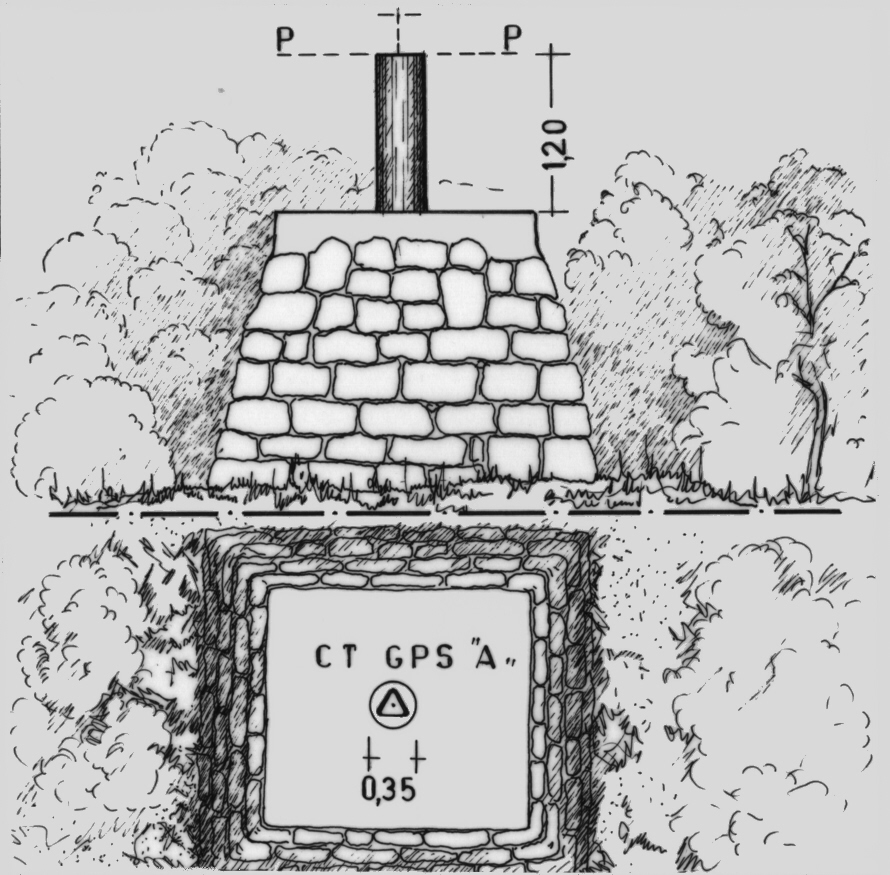 | materializzazione | Centrino di tipo "GPS A" fissato sul preesistente centrino di superficie IGM cementato alla sommità del pilastrino cilindrico in calcestruzzo su costruzione tronco-piramidale in pietrame. |