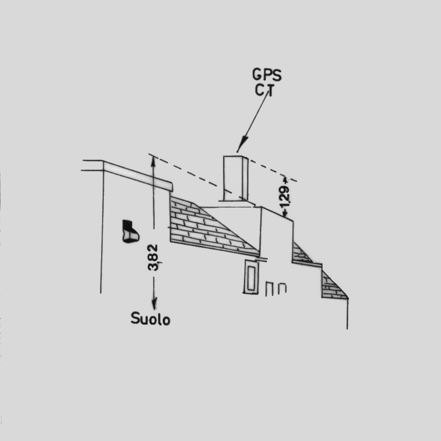 | materializzazione | Centrino di tipo "GPS A" fissato sul centrino di vetro in asse al pilastrino di tufo intonacato sul tetto della masseria. |