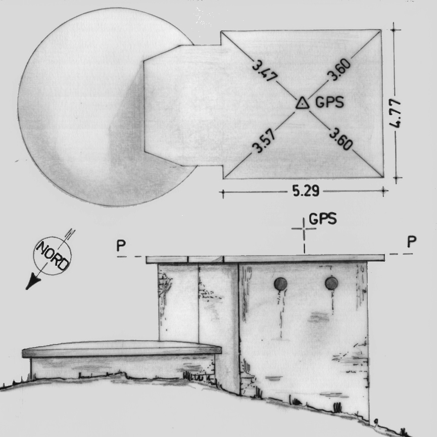 | materializzazione | Centrino del tipo "GPS A" fissato su preesistente centrino metallico IGM cementato in prossimità dell'asse geometrico della soletta di cemento armato a copertura del serbatoio idrico posto sulla cima della collinetta denominata "Viscigli", Contrada Confine in località Corno. |