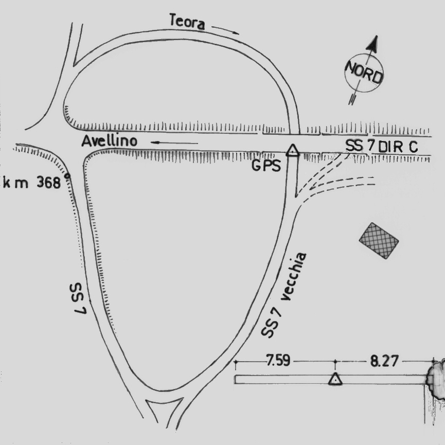 Centrino del tipo "GPS C" fissato in prossimità della metà della spalletta sud del cavalcavia all'altezza del Km 0.150 della S.S. 7 DIR/C ed in corrispondenza con l'intersezione con la S.S. 7 Appia.