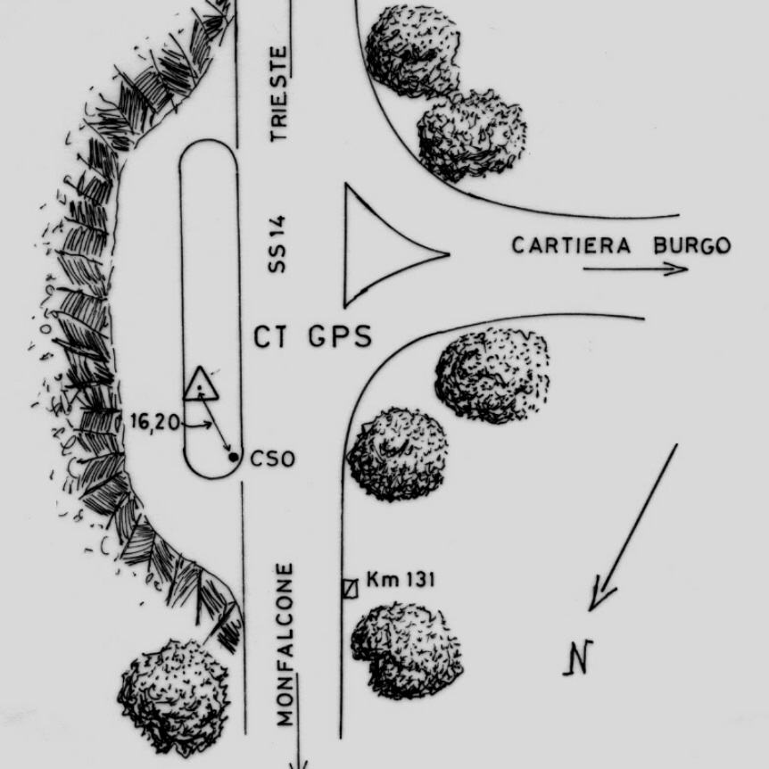 | materializzazione | Centrino in acciaio inox del tipo "GPS da livellazione" infisso nel bordo del marciapiede che costeggia ad est la S.S.14 di fronte al bivio per la Cartiera "Burgo". |
