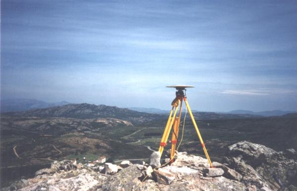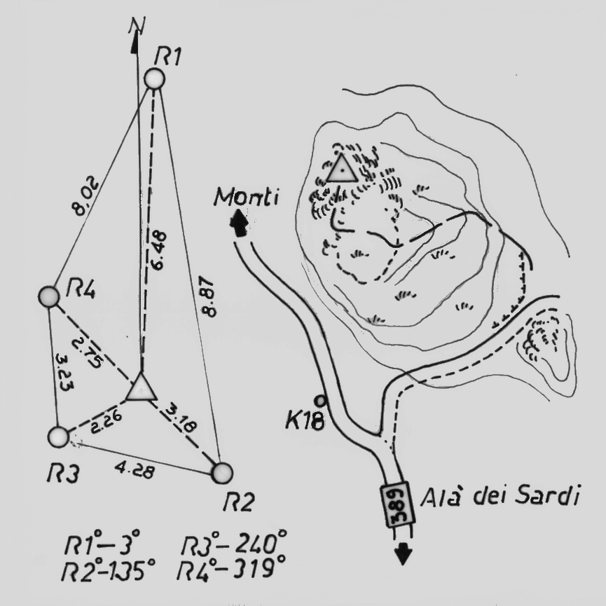 Centrino IGM del tipo di superficie fissato sul roccione a nord della sommità pianeggiante. Riferimenti: R1, R2, R3, R4 centrini metallici.