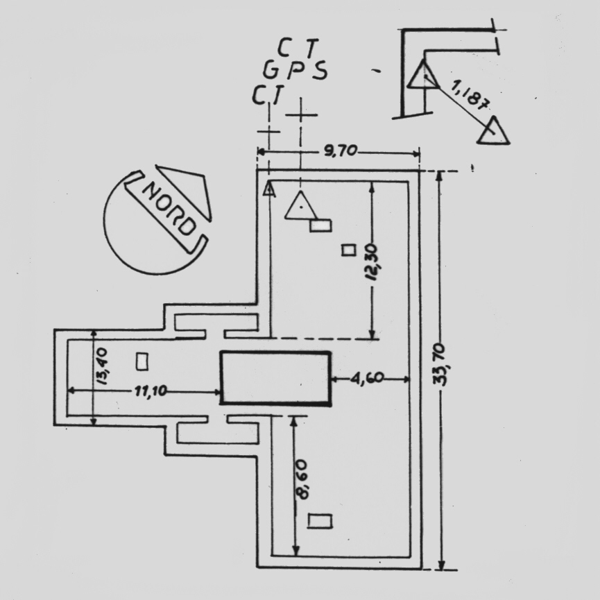 | materializzazione | Centrino del tipo "GPS C" fissato nel pavimento della terrazza superiore del grattacielo più basso dei due esistenti in Piazza Castello nel centro della città. |