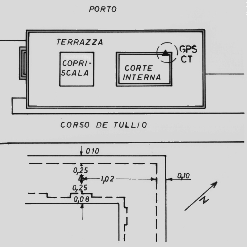 | materializzazione | Centrino della rete EUREF infisso presso lo spigolo nord del parapetto, prospicente la corte interna, situato sulla terrazza sovrastante l'edificio ove ha sede il "Laboratorio Chimico delle Dogane di Bari" in Corso De Tullio 1. |