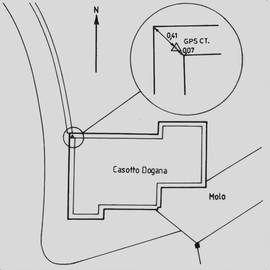 | materializzazione | Centrino di tipo "GPS C" fissato presso lo spigolo nord-ovest del cordolo di cemento che borda la sommità del Casello della Dogana (Sezione di S.Cataldo). |