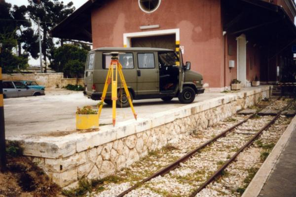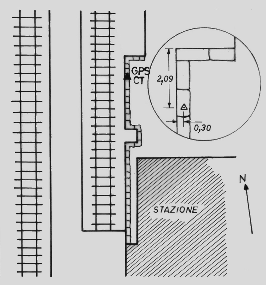 | materializzazione | Centrino "GPS C" fissato sul bordo del marciapiede accando al binario più a est, a nord dell'edificio della stazione ferroviaria di Palo del Colle. |