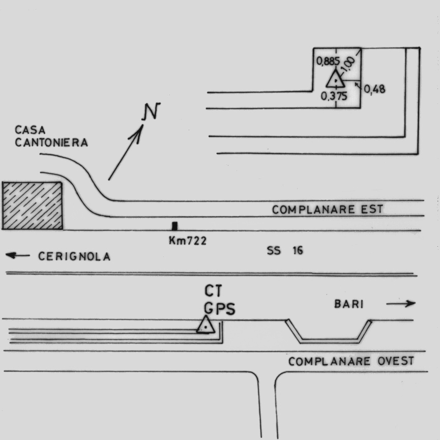 | materializzazione | Centrino del tipo "GPS C" infisso sul basamento in cemento del cordolo della canaletta di scolo delle acque in prossimità della Casa cantoniera al km 722+050. |