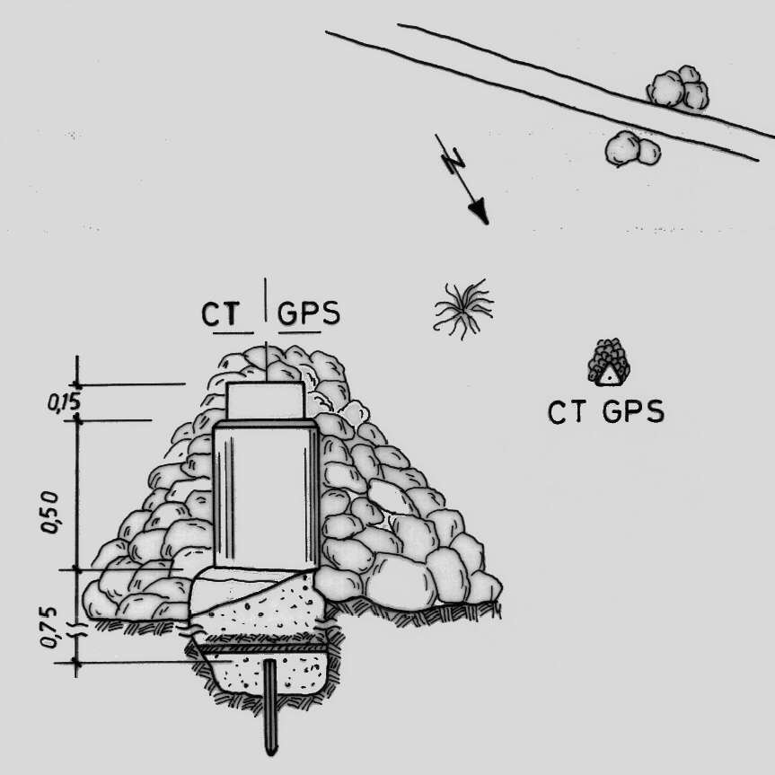 | materializzazione | Centrino di tipo "GPS A" fissato in asse al centrino di superficie posto su un pilastrino cilindrico in cemento. In asse al centrino di superficie si trova, infisso nel terreno, un picchetto in ferro profilato a "T". |