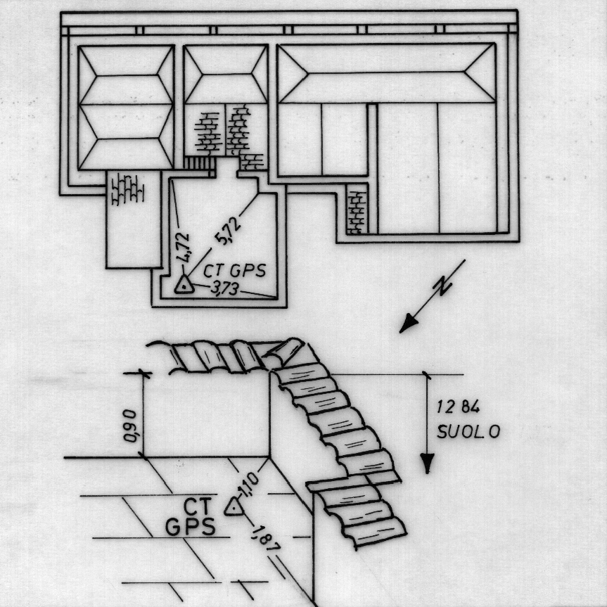 | materializzazione | Centrino del tipo "GPS C" fissato in asse alla croce incisa sulla lastra di granito del terrazzino della masseria. |