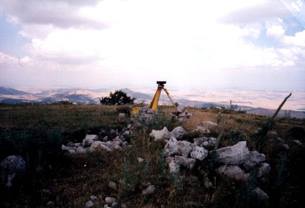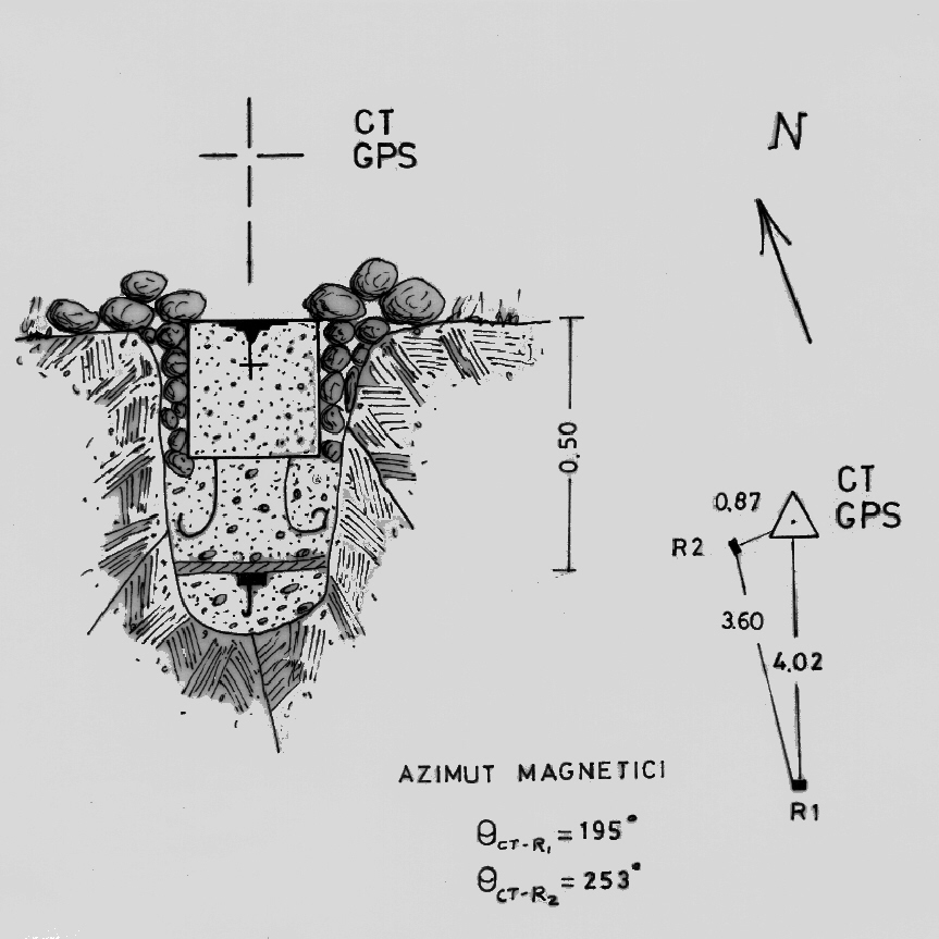 Centrino di tipo "GPS A" incollato su centrino di superficie in blocco di calcestruzzo prefabbricato, in asse a sottostante centrino di fondo. Riferimenti: R1, R2 termini di confine.