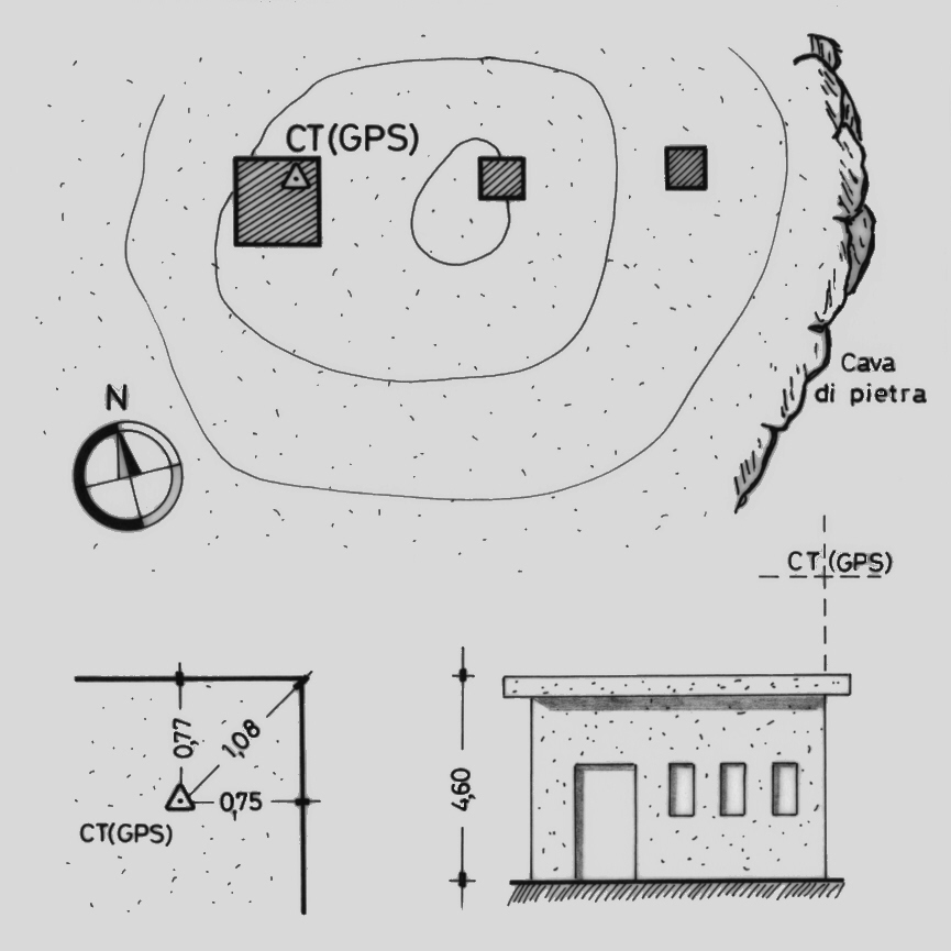 | materializzazione | Centrino del tipo "GPS C" fissato presso lo spigolo nord-est della soletta di copertura di un serbatoio idrico in cemento armato, ora in disuso. |