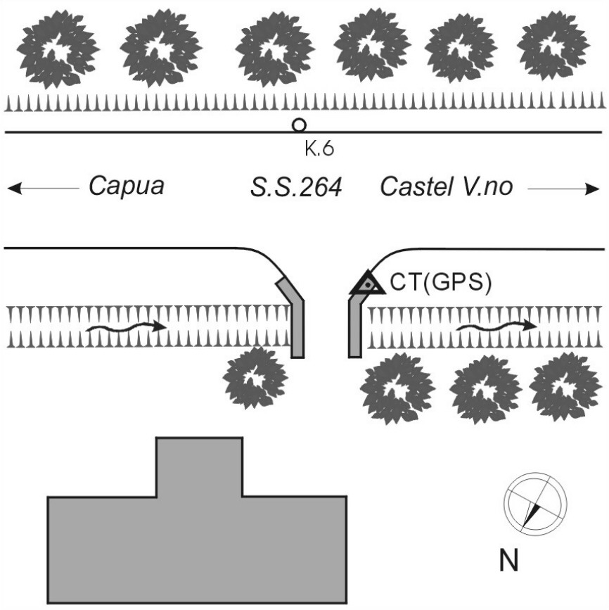 | materializzazione | Centrino in acciaio inox del tipo GPS da livellazione infisso alla sommità della paretina ovest, estremo sud, del ponticello in cemento armato ubicato all'altezza del km 6,000 della S.S.264. |