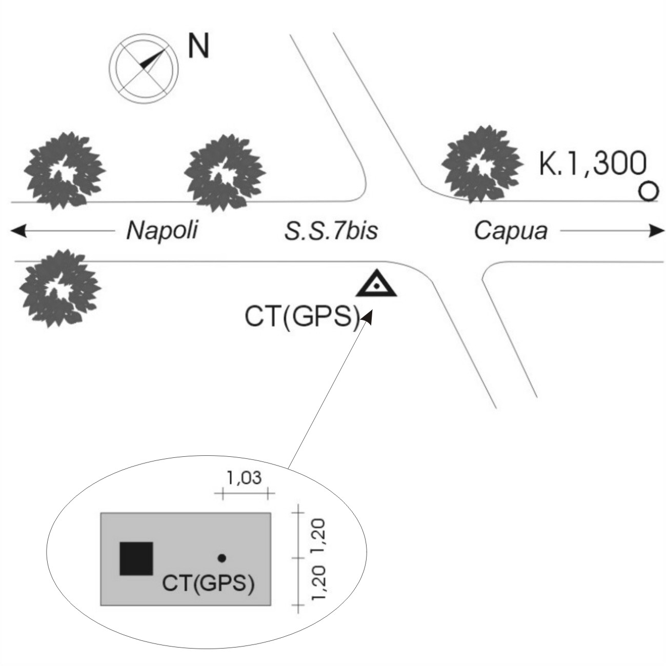 | materializzazione | Centrino in acciaio inox del tipo "GPS C" infisso nella soletta di copertura della cisterna idrica in cemento armato ubicata all'altezza del km 1,300 della S.S. 7 bis, in prossimità del Mercato ortifrutticolo di San Tammaro |