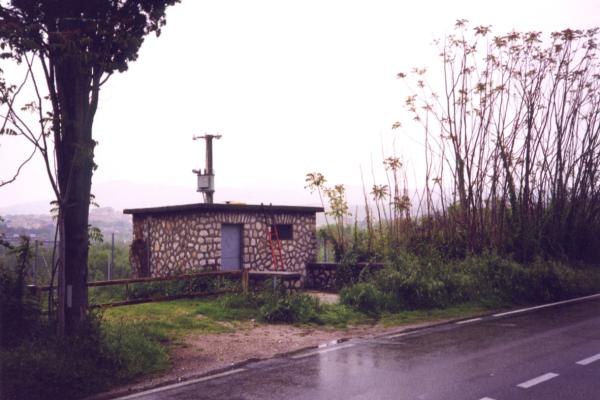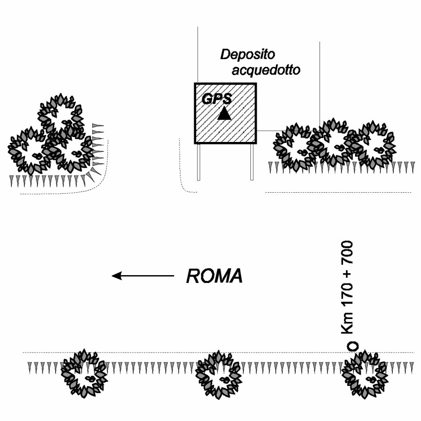 | materializzazione | Centrino in acciaio inox del tipo "GPS da livellazione" infisso nella sommità, in corrispondenza del centro geometrico, della soletta in cemento a copertura del casotto dell'acquedotto. |