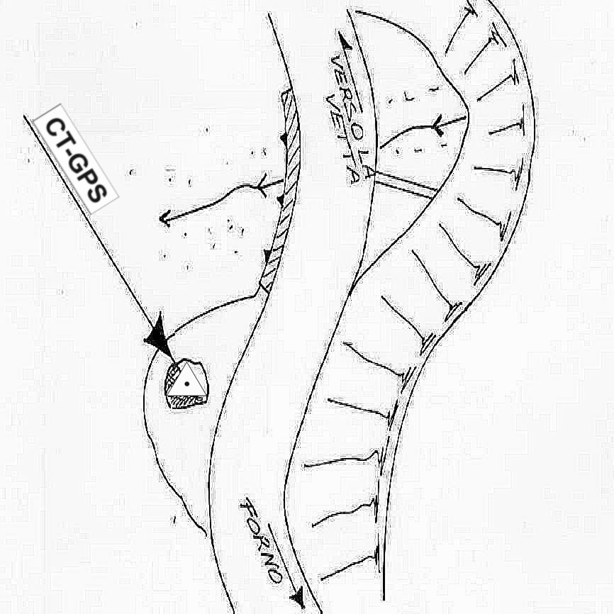| Materializzazione | Centrino in acciaio inox murato su roccia affiorante posto sulla sinistra della strada che dalla filanda di Forno sale verso Case del Veghereto, dopo il V tornante a circa 5-6 metri dal limite stradale. |