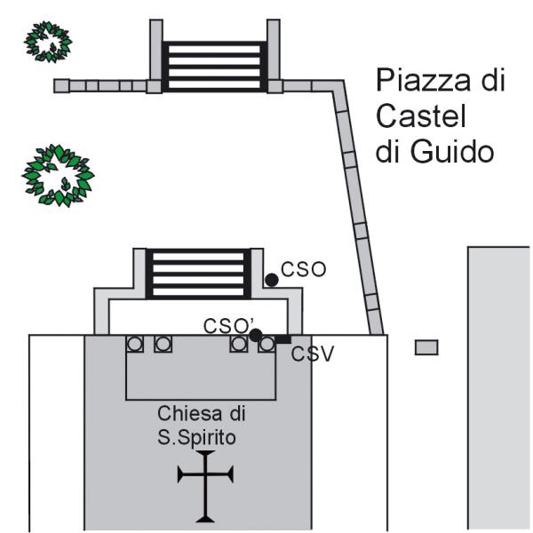 [{"simbolo_contrassegno":"P2","materializzazione":"(CSO) – Pozzetto interrato nell'angolo sinistro formato dalla scalinata d'accesso alla chiesetta."},{"simbolo_contrassegno":"B3","materializzazione":"(CSO') – Cerchio inciso sul plinto della prima colonna di sinistra del portico della chiesetta."},{"simbolo_contrassegno":"V3","materializzazione":"(CSV) – Piastrina in ghisa murata sulla lesena di sinistra della facciata della chiesetta."}]