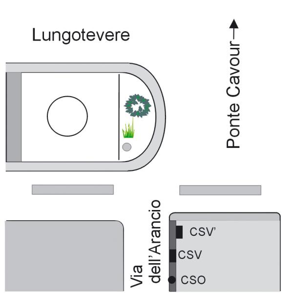 | Contrassegni | [{"simbolo_contrassegno":"B3","materializzazione":"(CSO) – Cerchio inciso sulla cornice sotto le finestre, a destra dell'idrometro."},{"simbolo_contrassegno":"V5","materializzazione":"(CSV) – Graduazione XVII dell'idrometro incasssato nella parete laterale della casa all'angolo con via dell'Arancio."},{"simbolo_contrassegno":"V5","materializzazione":"(CSV) – Linea di fede incisa in una targa di marmo, indicante il livello della piena del Fiume Tevere del 1805, incassata nella stessa facciata, a sinistra dell'idrometro."}] |