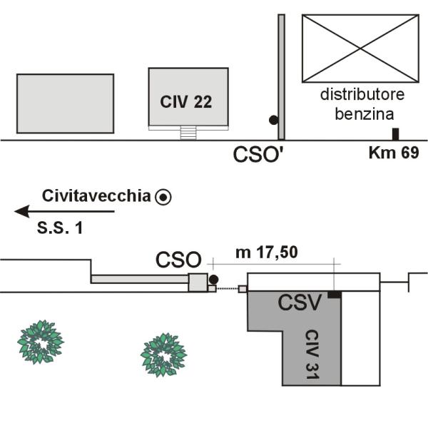 [{"simbolo_contrassegno":"P2","materializzazione":"(CSO) – Pozzetto in ghisa posto alla base del muro di cinta, a destra del portoncino d'ingresso al n\u00b0 31."},{"simbolo_contrassegno":"B1","materializzazione":"(CSO') – Bullone infisso alla base del muro in c.a. che delimita la propriet\u00e0 del civ.n\u00b022, lato rivolto verso Civitavecchia."},{"simbolo_contrassegno":"V1","materializzazione":"(CSV) – Mensola infissa sulla parete del prospetto lato strada, spigolo sinistro, a circa 17,50 m dal CSO."}]