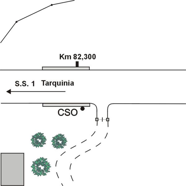 | Contrassegni | [{"simbolo_contrassegno":"B1","materializzazione":"(CSO) – Bullone infisso all'estremit\u00e0 sinistra del parapetto con direzione Tarquinia al Km 82,300."}] |