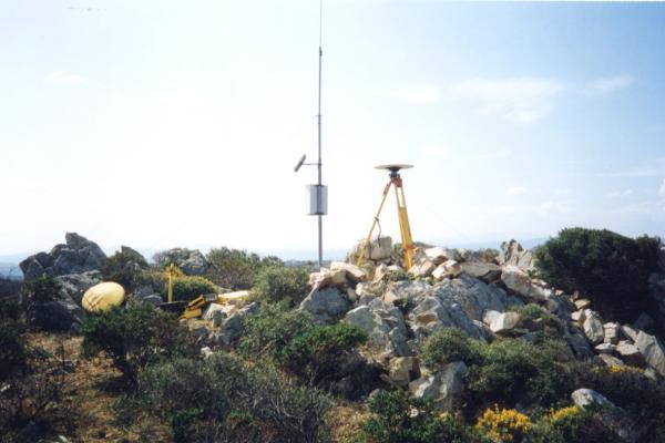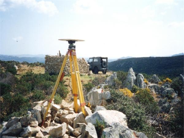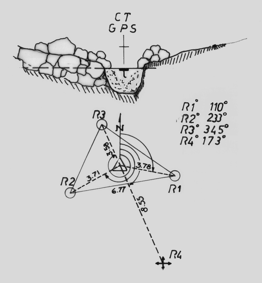 Centrino del tipo "GPS A" fissato su preesistente centrino IGM del tipo di fondo. Riferimenti: R1, R2, R3 centrini metallici; R4 antenna.