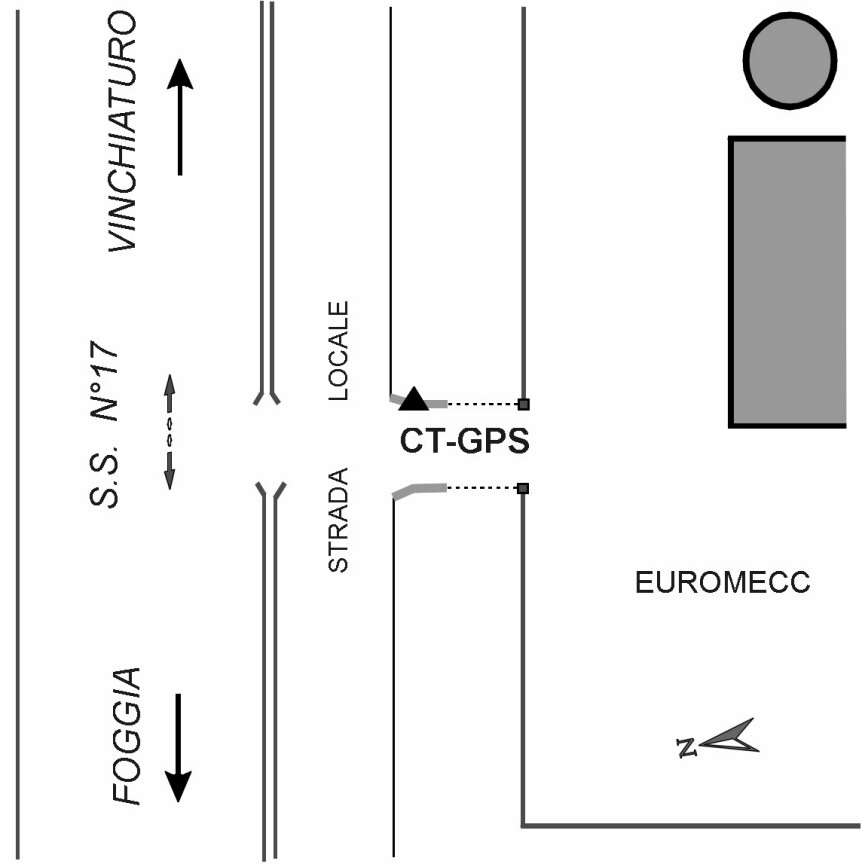 | materializzazione | Centrino in acciaio inox del tipo "GPS da livellazione" infisso nella spalletta in cemento armato esistente a sinistra dell'ingresso carrabile dello stabilimento "Euromecc". |