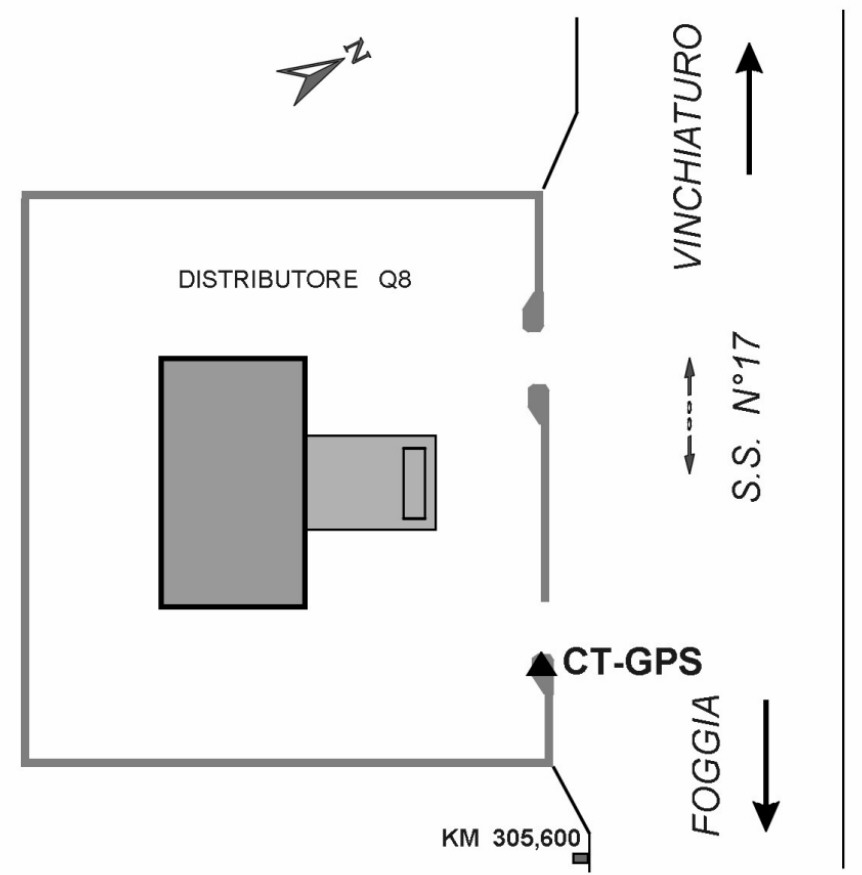 | materializzazione | Centrino in acciaio inox del tipo "GPS da livellazione" infisso nel blocco in cemento armato esistente sulla sinistra del secondo, procedendo in direzione di Foggia, ingresso carrabile dell'area di servizio. |