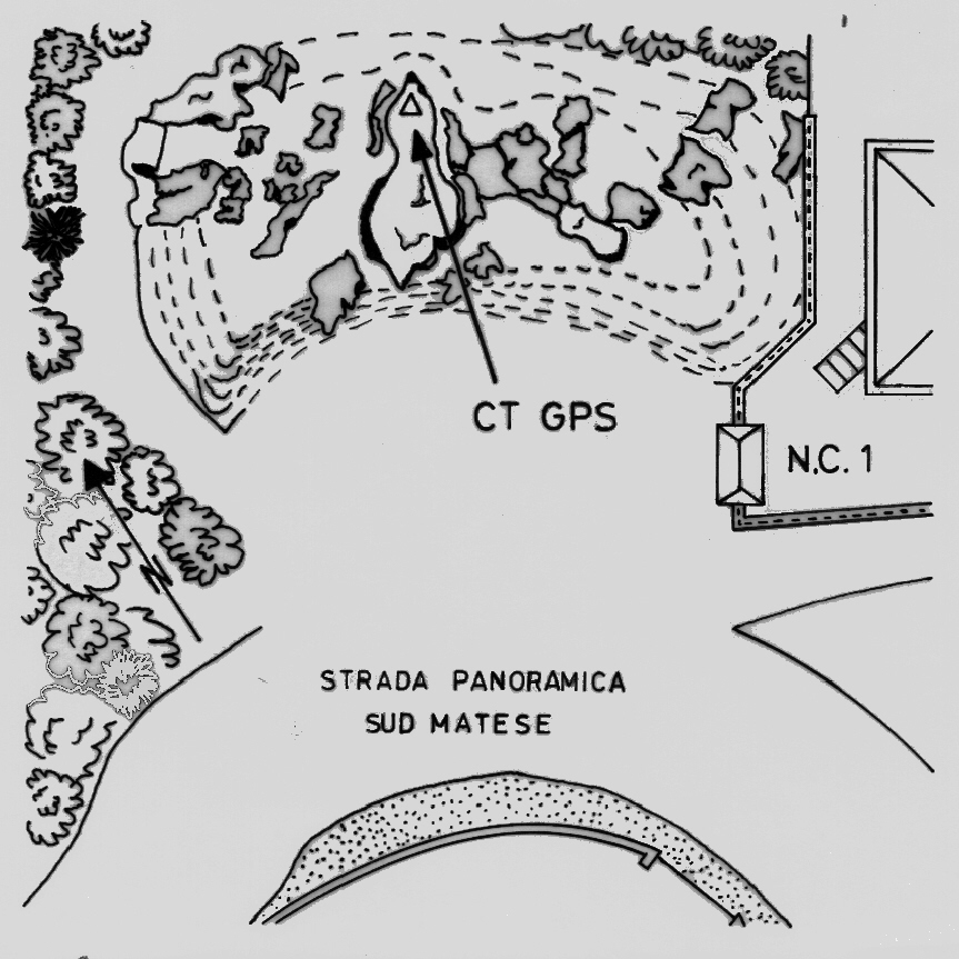 Centrino di tipo "GPS C" fissato sulla punta, approssimativamente triangolare, della roccia di maggiori dimensioni rispetto al gruppo di cui fa parte.