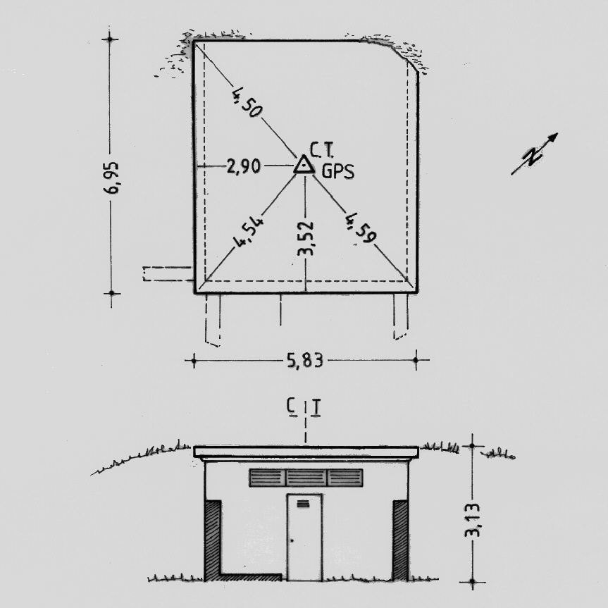 Centrino di tipo "GPS A" fissato su centrino metallico di fondo cementato sulla soletta di copertura di un serbatoio idrico dell'acquedotto Molisano posto sulla collina denominata Serra Crocella a sud – ovest del paese di Castropignano.