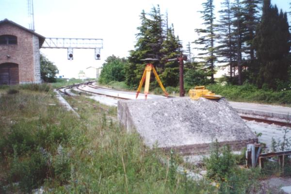 | materializzazione | Bulloncino in acciaio inox da livellazione del tipo GPS infisso nella sommità della struttura in calcestruzzo esistente al termine di un binario secondario ora in disuso. |
