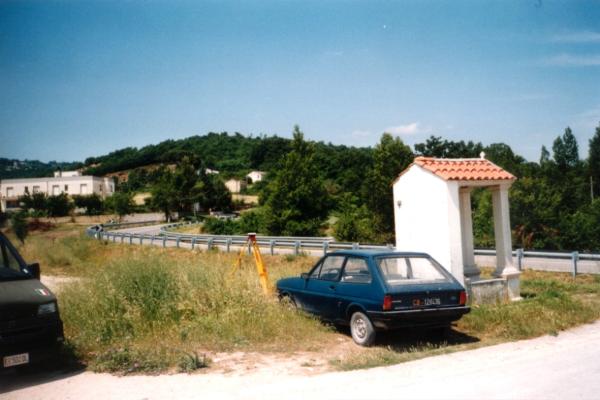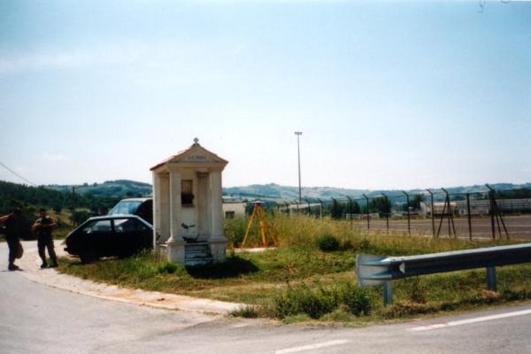 | materializzazione | Centrino in acciaio inox del tipo "GPS da livellazione" infisso in corrispondenza del centro geometrico del basamento del tombino della fognatura ubicato presso il tabernacolo. |