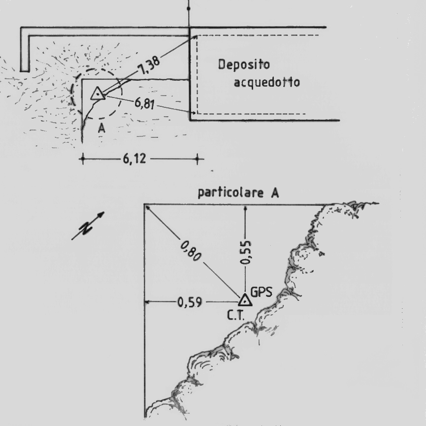 | materializzazione | Centrino di tipo "GPS C" fissato in prossimità dello spigolo sud-ovest del muro di contenimento del serbatoio interrato, posto sullo sperone roccioso a nord – est del paese di Campitello Matese. |