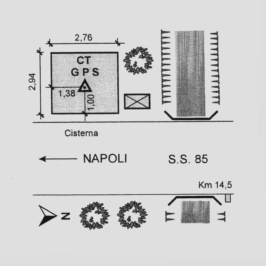 | materializzazione | Bulloncino in acciaio inox da livellazione del tipo GPS infisso nella sommità della soletta in calcestruzzo armato della cisterna ubicata a margine della S.S. n°85 in prossimità del km 14,500 e del ponte sul Rio S.Bartolomeo. |