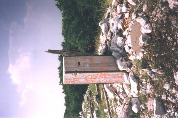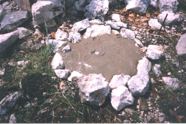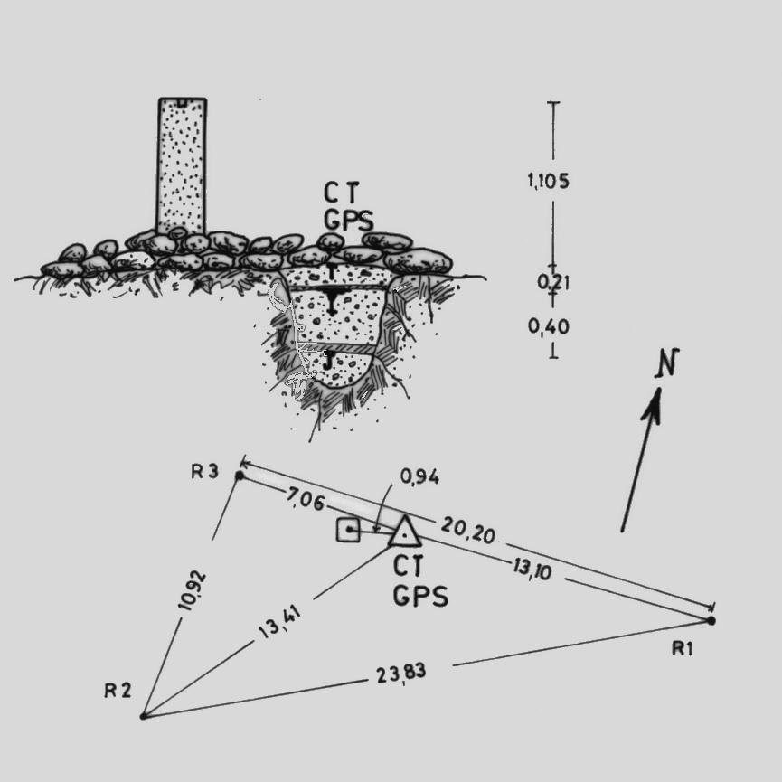 Centrino di tipo "GPS C" cementato coassialmente a sottostanti e preesistenti centrini IGM del tipo di superficie e di fondo, alla sommità del Monte Cairo.