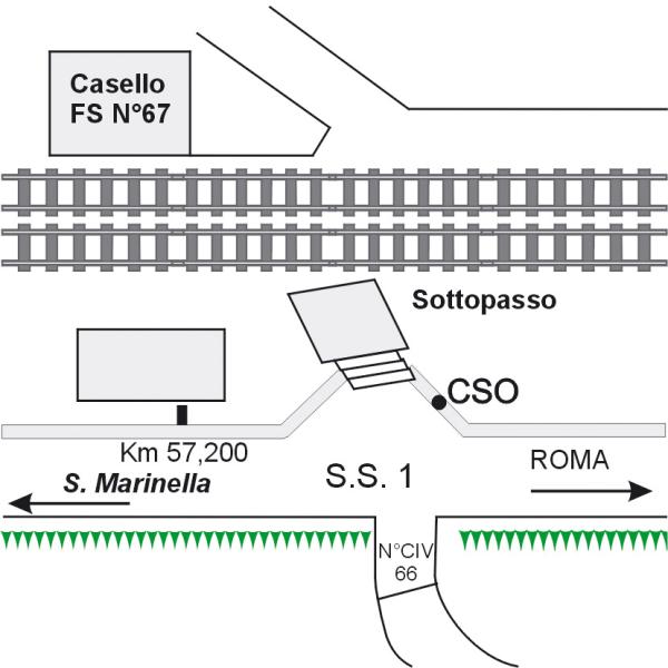 | Contrassegni | [{"simbolo_contrassegno":"B1","materializzazione":"(CSO) – Bullone infisso alla base del muretto in c.a. all'ingresso del sottopasso di Quartaccia al Km 57,200 della S.S.1 che conduce al casello n\u00b067."}] |