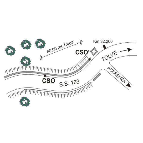 | Contrassegni | [{"simbolo_contrassegno":"B1","materializzazione":"(CSO) – Bullone infisso nel cordolo di contenimento a monte della strada, a 9,00 mt dal cambio altezza, posto sulla S.S.169 al Km 32,300, a circa 150 mt prima dell'incrocio per Acerenza-Forenza in direzione Tolve."},{"simbolo_contrassegno":"B2","materializzazione":"(CSO') – Chiodo anonimo di altro ente, con iscrizione BRA117, fissato sulla sommit\u00e0 del cordolo di contenimento a monte della strada, nei pressi di un tombino, quasi di fronte allo stesso incrocio."}] |