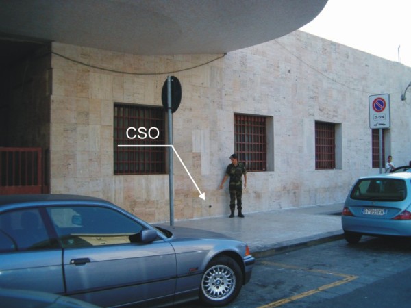 [{"simbolo_contrassegno":"B1","materializzazione":"(CSO) Bullone infisso nella facciata esterna, a destra, in corrispondenza della fine della pensilina."}]