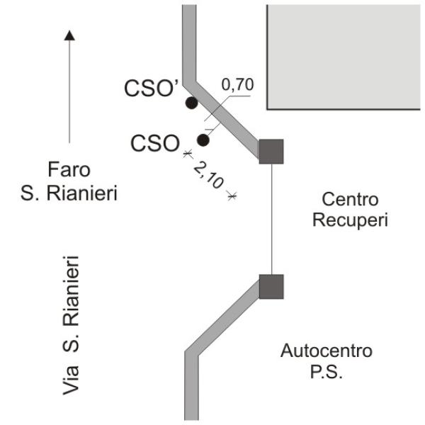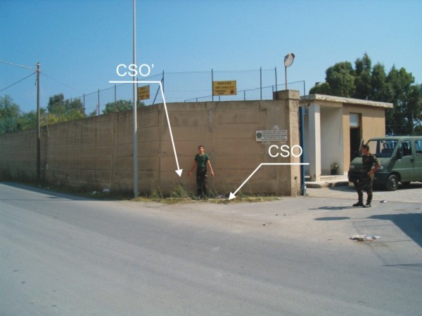 | Contrassegni | [{"simbolo_contrassegno":"P3","materializzazione":"(CSO) Chiusino in ghisa posto a sinistra dell'ingresso del \"Centro Recuperi\" della Polizia a 2,10 metri dal cancello e a 70 cm dal muro perimetrale."},{"simbolo_contrassegno":"B1","materializzazione":"(CSO') Bullone infisso nel muro perimetrale , lato pozzetto, a 1 metro dallo spigolo esterno."}] |