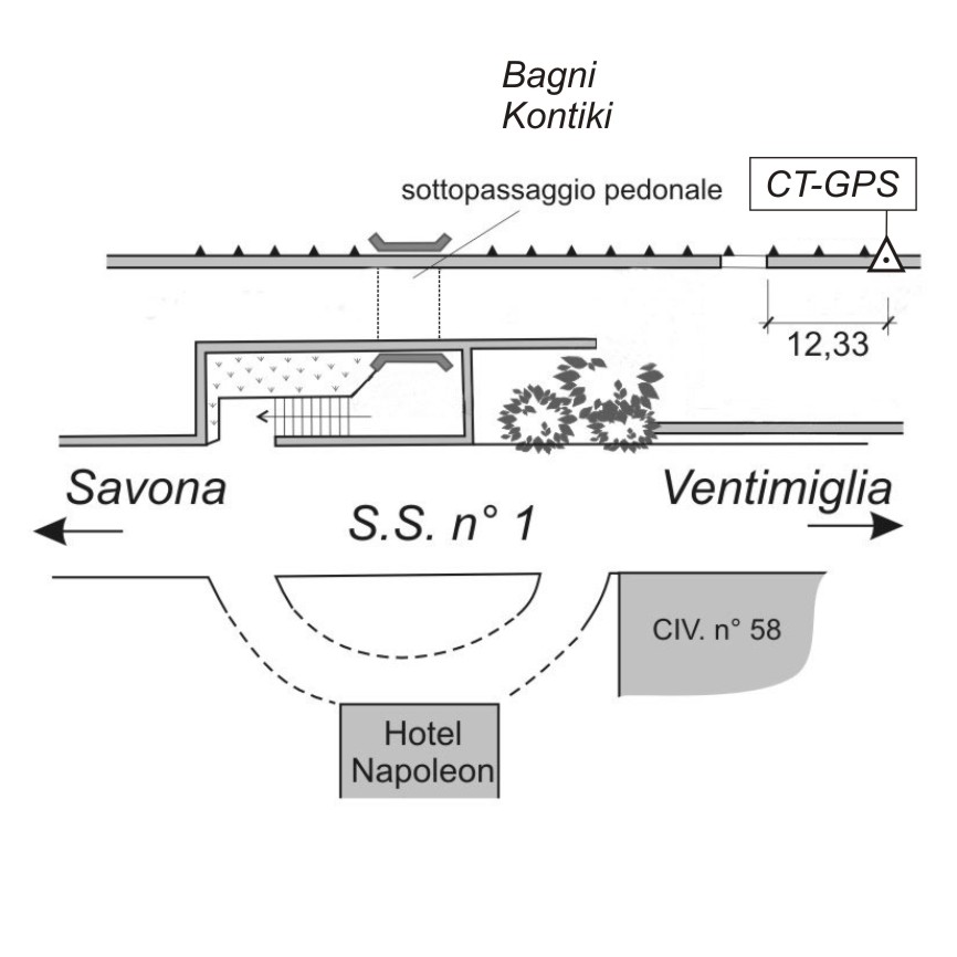| Materializzazione | Centrino del tipo "GPS C" infisso sul muro a retta che sovrasta lo stabilimento balneare "Bagno Kontiki", sul lungomare di San Remo, circa 100 metri dopo l'Hotel "Napoleon" (per chi proviene da Genova). |