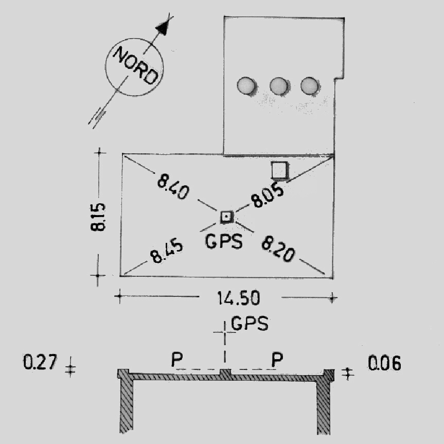 | Materializzazione | Centrino del tipo "GPS A" fissato su preesistente centrino IGM cementato in blocchetto di calcestruzzo prefabbricato, ancorato a piastra metallica posta in posizione pressochè centrale della terrazza di copertura del corpo più a sud del molino. |