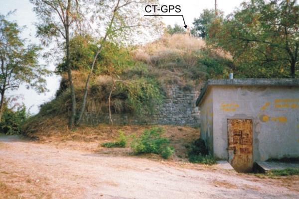 | Materializzazione | Centrino del tipo "GPS A" fissato su preesistente centrino IGM, cementato in blocchetto prefabbricato, posto coassialmente al centrino di fondo. Il punto è ubicato alla sommità, lato nord, dei ruderi delle mura del Castello Malatesta. |