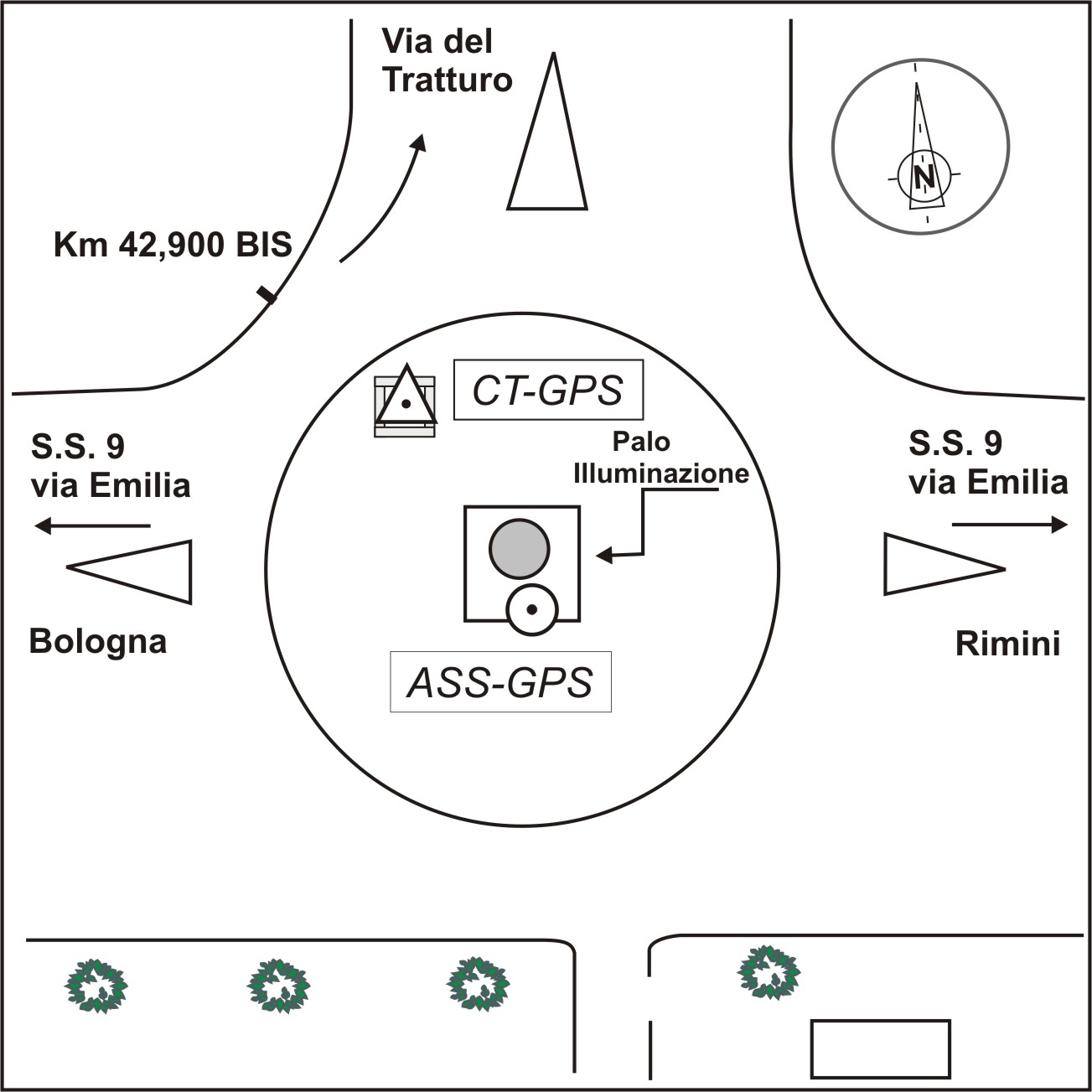 | Materializzazione | Centrino GPS in acciaio Inox del tipo C infisso sulla sommità della piattaforma in cemento d'accesso alla centralina SIP-TEL C2 posto all'interno della rotonda, lato rivolto verso via del Tratturo. Misurabile con 1/2 sfera. |